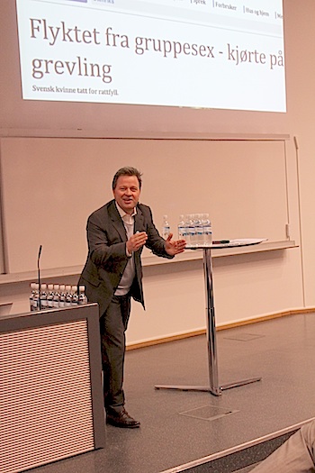 |  ENGASJERT: Arne Hjeltnes holdt foredrag om viktigheten av å skaffe seg kompetanse og erfaring fra utlandet. Her viser han fram en sak fra Bergens Tidene brukt som eksempel på at med alle digitale flatetene vi har fått, gjør det utfordrende for avisene å kapre leserne. - Denne saken har virkelig alt, det er gruppesex, rattfyll og svensk kvinne, sa Hjeltnes. |