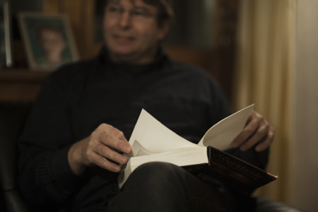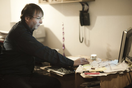 Gaarder har satt seg foran PC-en. Han blar i artikler han har skrevet; peker på bilder. Han er overbevist om at PC-en er under overvåkning og utelukker ikke at han kan være i fare.