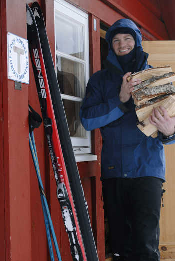 | DNT-HYTTER: Turveileder for Den Norske Turistforening, Anders Gjengedal, ved inngang til en selvbetjente hytte i Femunden, «Marenvollen». |